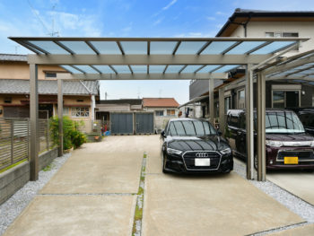 | 新車を購入されたばかりなのに雪で何回も汚れてしまい、屋根を早急にご希望されてました。既存の屋根との高さや被り、境界ラインが斜めになってる事など、規格外の納まりが難しい条件でしたが、豊富なバリエーションの三協アルミ「スカイリード」を採用し、庭奥の物置まで車を停める事もあるので間口は最大に広げて設置しました。車庫幅最大に広げた事により安心して駐車でき、勝手口までの動線も雨を防ぐ事ができるようになりました。スタイリッシュなフラット屋根デザインでありながら高い強度を確保し、シャイングレーでまとめることで既存屋根やフェンスとも調和のとれた外構となりました。 |