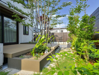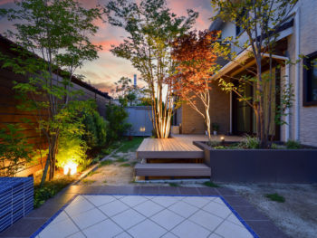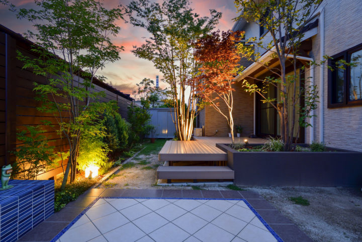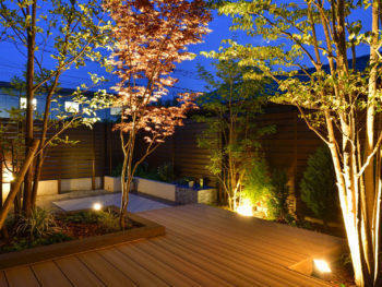 | 段階的に工事していき、少しずつ施工個所を増やして数年越しに完成したお庭です。途中別業者が入り、お施主様の要望とは全く違うものが出来ていたので、樹木以外撤去処分し、一部作り変えも行いました。既存の樹脂デッキは延長し、樹木を残しつつ住宅の雰囲気にもあっていなかった花壇は撤去して、新規で高さを変えた花壇を作り直しました。夜は家の中やデッキからの景観を重視したライトアップを計画し、昼とはまた違った表情が楽しめます。段違いの植栽にライティングすることで、お庭のタイルテラスからも景観を楽しまるようになっています。これだけ植栽にボリュームがあると、立体感や奥行感を演出しやすく、夏は木陰を作ってくれて、冬は落葉して日を取り入れてくれます。目隠しフェンスが背が高いので、それよりも大きい植栽が手前に来ると圧迫感も和らいでおすすめです。 |