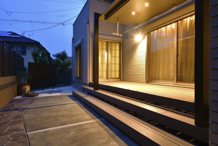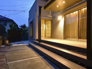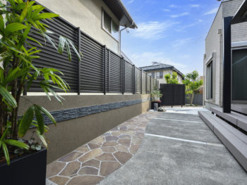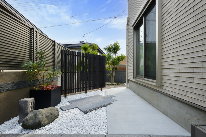 | お庭の雑草対策をしながら、リビングの窓から見ても気持ちのいいお庭をイメージしました。和室から見える一角には、簡単な坪庭スペースをご提案。シックな色合いの壁と床面が和庭の優しい色遣いを演出しています。プライバシー対策として木目のフェンスを設置。床面の石材を組み合わせたアイポイント空間となっています。テラス屋根にはLIXILの注目商品「テラスSC」をご提案。天井材があることでよりプライベート空間の増したお庭に仕上がっています。テラスSCにはオプションでダウンライトを取り付けることができるので夜は幻想的な空間でお食事などいかがでしょうか。 |