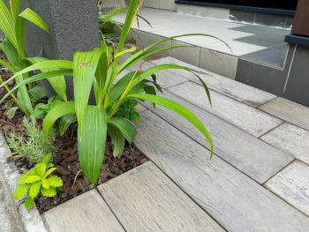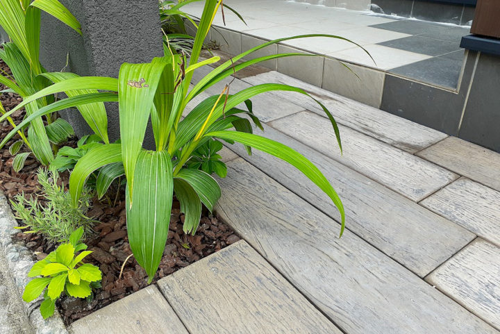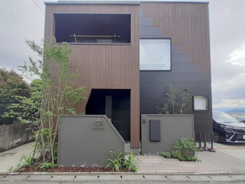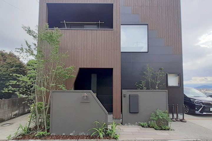 | 外壁塗装と外構リフォームの工事をしました。外壁の色をブラックに変えたい、門周りをナチュラルでありながらシックな外構に作り変えたいとご依頼頂きました。特徴的な玄関入り口の形をモチーフに門壁をデザイン。モノトーンでシックな外構へ変わりました。はじめは施主様の考えとして大きな樹木を植える予定はありませんでしたが、インパクトのある大きなモミジと、リビングから見える坪庭には細くて幹肌が特徴的なアオダモをご提案させて頂きました。アプローチは施主様こだわりのTOYO工業『レイルスリーパー』を採用。木彫がリアルなコンクリート平板はナチュラル感を演出。シェード付きマリンライトもとてもオシャレです。 |