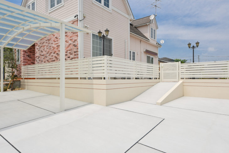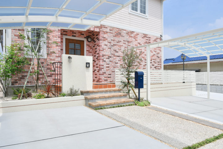 | 駐車スペース拡張のご相談をいただきました。 トラックが停められるようにしたいとのご要望をいただきましたが、 既存の駐車スペースは道路の傾斜と車庫勾配がきつく駐車しにくい設計で あったため、車庫土間の仕上げを既存よりも低く計画し勾配を緩やかにしました。 3台分のカーポート屋根で雨の日も安心です 門塀は車の出入りの邪魔にならないようにポーチ前に配置し、玄関の目隠しを兼ねています。 建物に合わせたピンクのラインとネイビーのポストがアクセントです。 |