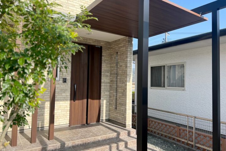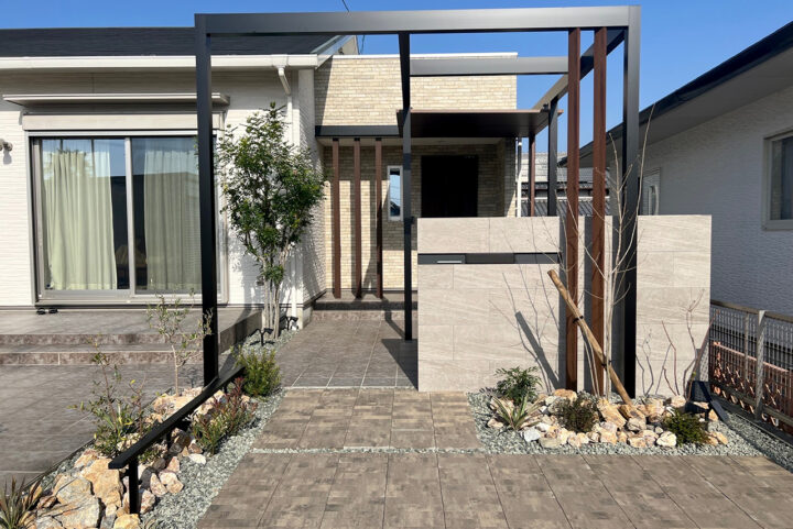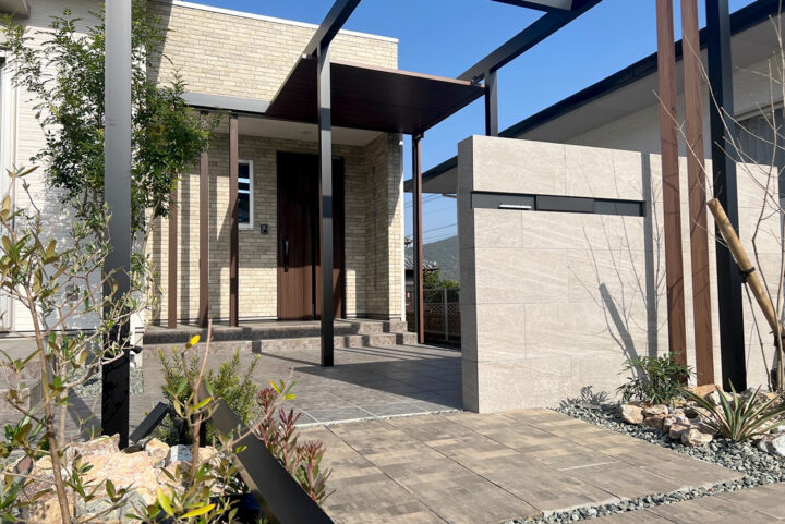 | 外構リフォームでガラッと印象を変え、かっこよくモダンな印象になるようデザインさせていただきました。玄関への雨の降り込みに悩まれていたので、LIXILプラスGのポイントルーフを設置。外壁と既存タイルの色味に合わせて、落ち着いた色味で統一し、建物とエクステリアの一体感を意識しました。フレームフェンスでさりげなくテラス空間とアプローチを仕切り奥様セレクトのアガベも植えました。モダンなエクステリアにピッタリです。 |