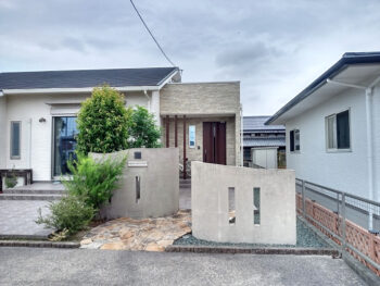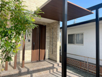 | 外構リフォームでガラッと印象を変え、かっこよくモダンな印象になるようデザインさせていただきました。玄関への雨の降り込みに悩まれていたので、LIXILプラスGのポイントルーフを設置。外壁と既存タイルの色味に合わせて、落ち着いた色味で統一し、建物とエクステリアの一体感を意識しました。フレームフェンスでさりげなくテラス空間とアプローチを仕切り奥様セレクトのアガベも植えました。モダンなエクステリアにピッタリです。 |