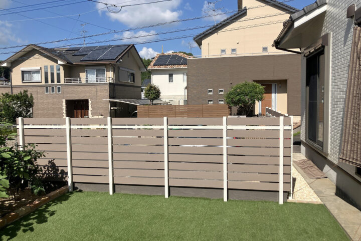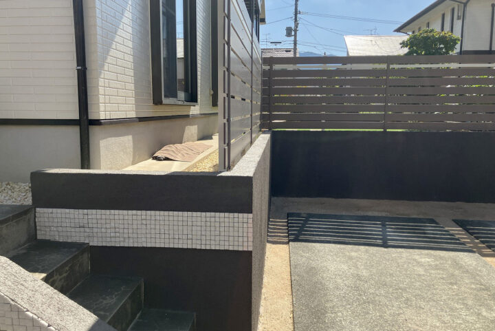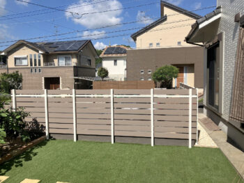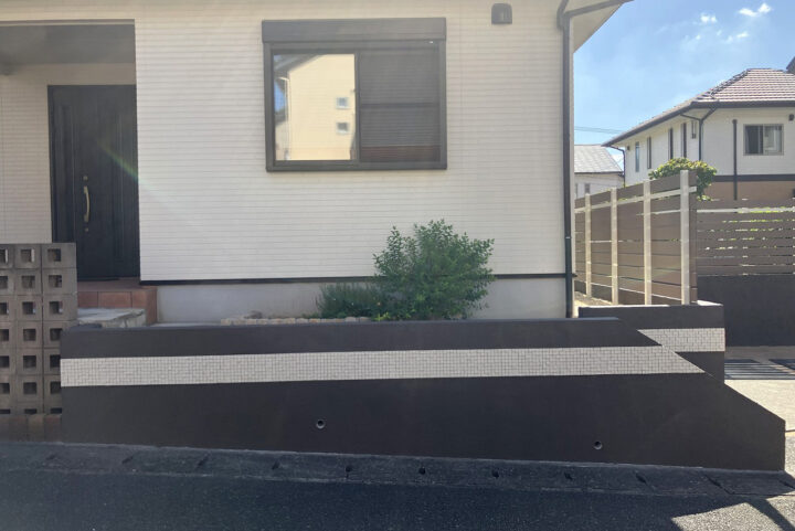 | 土留めブロックのリフォームと目隠しフェンス工事を行いました。道路側からリビング前の視線をやわらかく遮るため、木調柄が美しい人工木フェンス「Eウッドスタイル極」を採用し、ホワイトの細い板をアクセントに加えています。施工前はメッシュフェンスで目隠し効果が弱く、塀の汚れも気になっていましたが、今回は塀をグレーとブラウンの中間色に塗り替え、モザイクタイルで表情をプラス。明るさを抑えた落ち着きのある印象に生まれ変わりました。庭側から見ても白い柱と木目が映え、立体感のある仕上がりに。視線を気にせず、リビングや家庭菜園の時間を快適に楽しめる外構となりました。 |