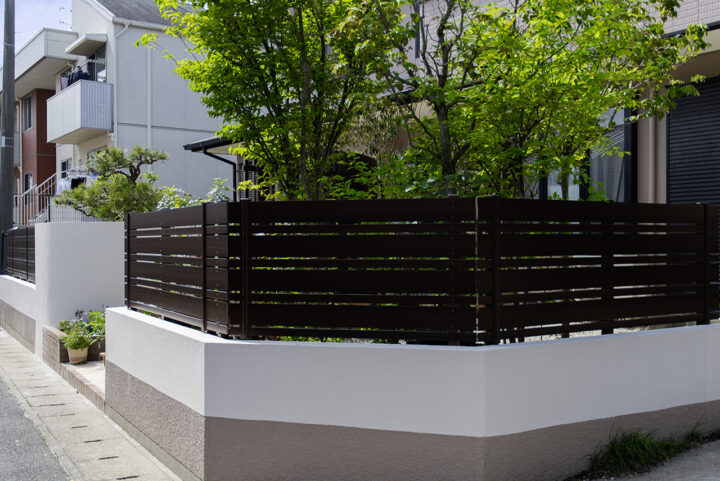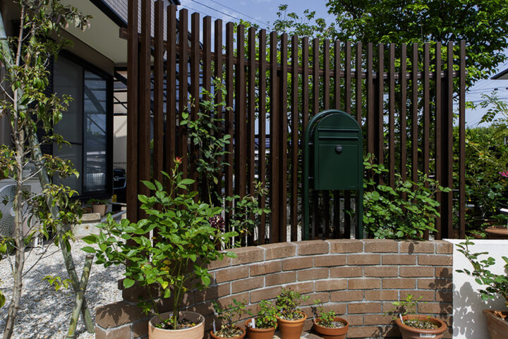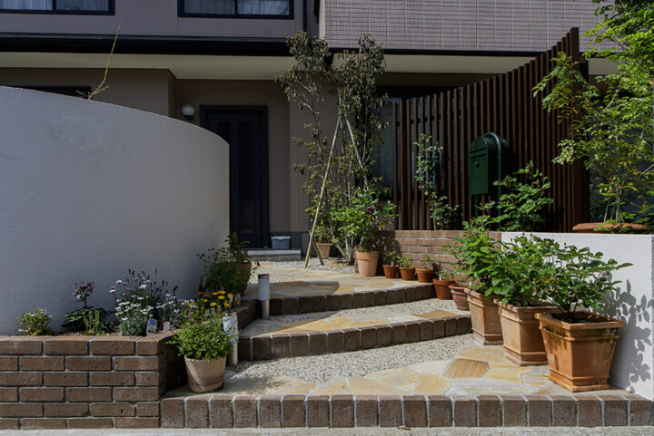 | 生垣の撤去と境界ブロックの積み増しをきっかけに、セミクローズ外構の全体リフォームをご依頼いただきました。門塀とアプローチは、曲線デザインに大胆に一新し、レンガや自然石を使って明るく柔らかな雰囲気を演出。また、生垣を撤去してブロックの内側に目隠しフェンスを設置し、スッキリとした印象に仕上げ、メリハリのある外構となりました。 |
