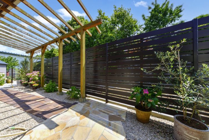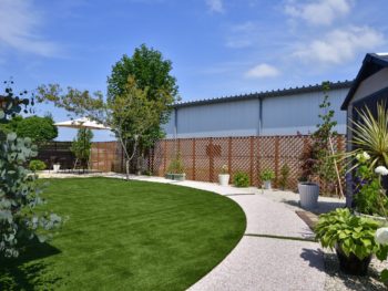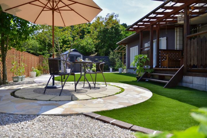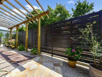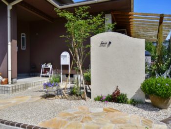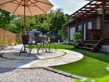 | ガーデニング好きのご夫婦でDIYをしたり植栽のお世話を楽しまれていましたが、 今回思い切ってスッキリ雑草対策をしたいとご相談をいただきました。 外構は、シンプルでナチュラルな門周りながら、門塀の天端をアールにしたり足元の乱形色で変化を付けたデザインに。 お庭はご夫婦のカフェスペースとしてサークルテラスと、お孫さんとわんちゃんが遊び回れる人工芝で雑草対策をしました。 テラスはデッキから降りてすぐの、使いやすく、一番リビングから目に入る位置に配置。 乱形石とコンクリート平板、豆砂利洗い出しを組み合わせてデザインしました。 テラスへ向かうアプローチは、円を描くようにカーブさせ、お庭を広く使っていただけるように工夫しました。 記念樹や思い入れのある樹木は残し、敷地の角や目に入る位置には新しい雑木風の樹木をご提案。 徐々に植栽を増やしていけるように周りは防草シートと砂利敷きをしました。 工事後、ご夫婦でアプローチにレンガを敷かれたり、鉢植えやグランドカバーを増やされ、できるところは自分たちでと温かみのある、緑いっぱいの素敵なお庭となりました。 |