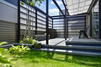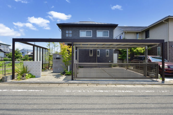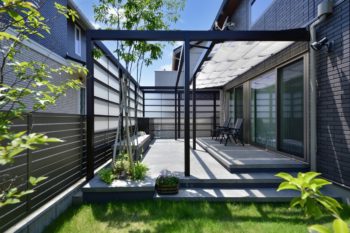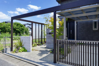 | 既存のカーポートやアプローチにフレームを設置して、重厚感のあるファサードに仕上げました。カーポートの屋根枠が隠れるようにLIXIL「+G」の梁幅が太いものを設置、導線の邪魔にならないよう取り合い、縦パネルを入れて隣地からの目線も考慮しました。メインのお庭にも+Gスクリーンでプライベートを確保し、大判のタイルを貼ってテラスにさせて頂きました。+Gの横ラインパネルは欲しい位置にパネルを入れることができるので、お好きな高さから目隠しできて便利です。 |