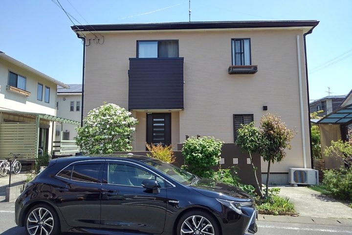 | ご新築の外構も当社で施工させて頂いたS様。10年という事で、今回は外壁塗装の工事を行わさせていただきました。前回のシックな白と黒の外壁から変更し、今回はベージュとブラウンで塗装させていただきました。S様からも良い色ねと喜んで頂き嬉しかったです。 |