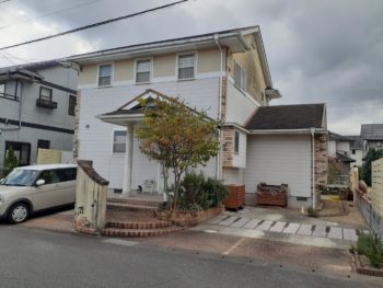 | 使用商材 | 幕板下外壁:塗料SR-161(SK化研)、幕板上外壁:塗料SR-414(SK化研)、屋根:塗料No,15黒(水谷ペイント)、幕板・玄関柱・門塀:塗料(SK化研) |